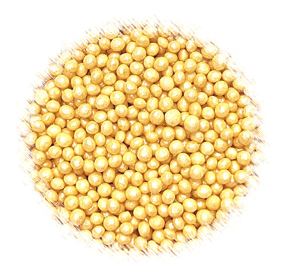 Shop our bulk Sprinkle-It® tiny chocolate crispy pearls in shimmer soft gold 3mm size. They come in a 5 cup bulk bag (approx. 2.5lbs) or a 20 cup wholesale sprinkle case (approx. 10lbs). These are the sprinkles everyone loves as they won't hurt your teeth! Use these pretty sprinkle toppings for decorating chocolates, cakes, cupcakes, mini donuts and cookies. They're candy coated pearls made of a tiny rice cereal core that have a soft white candy coating shell. Their slight soft crunch is easier on your teeth and fun to enjoy! See all of the fun edible toppings we carry here.