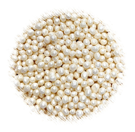Shop our bulk Sprinkle-It® tiny chocolate crispy pearls in shimmer white 3mm size. They come in a 5 cup bulk bag (approx. 2.5lbs) or a 20 cup wholesale sprinkle case (approx. 10lbs). These are the sprinkles everyone loves as they won't hurt your teeth! Use these pretty sprinkle toppings for decorating chocolates, cakes, cupcakes, mini donuts and cookies. They're candy coated pearls made of a tiny rice cereal core that have a soft white candy coating shell. Their slight soft crunch is easier on your teeth and fun to enjoy! See all of the fun edible toppings we carry here.