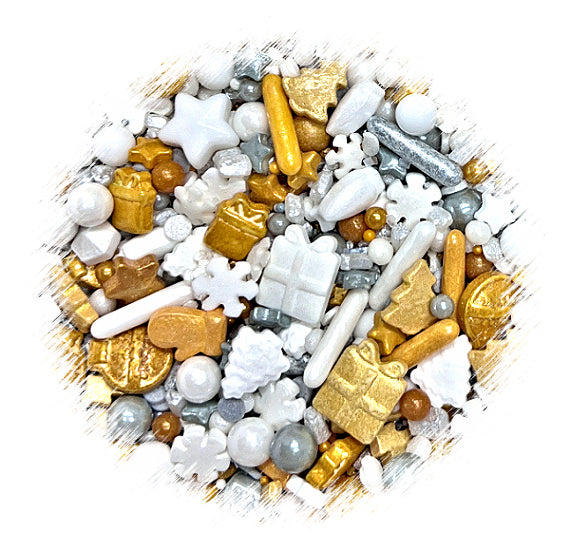 Our deluxe limited edition Sprinklefetti™ Christmas Sprinkles Mix in silver and gold with white is a holiday must have for your sweet treat decorating. This elegant holiday sprinkle mix you'll find nonpareils, sugars, jimmies, small rock candy pieces, sugar pearls, polka dot quins sprinkles, candy rods along with present, snowflake, mitten, stars, stockings, ornaments candy shaped sprinkles and more. Our luxury sprinkle mixes are a perfect blend of tiny to large sprinkle pieces providing you with more detail to add to your sweet bakes. They also contain some hand painted elements making them extra special. Use this mix to decorate winter cupcakes, cakes, cookies and more. See all of the Sprinklefetti™ mixes we carry here.