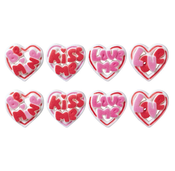 COUNT: 12 large heart sugar toppers in assorted designs + sayings (you'll get 2 cards with 6 per package)